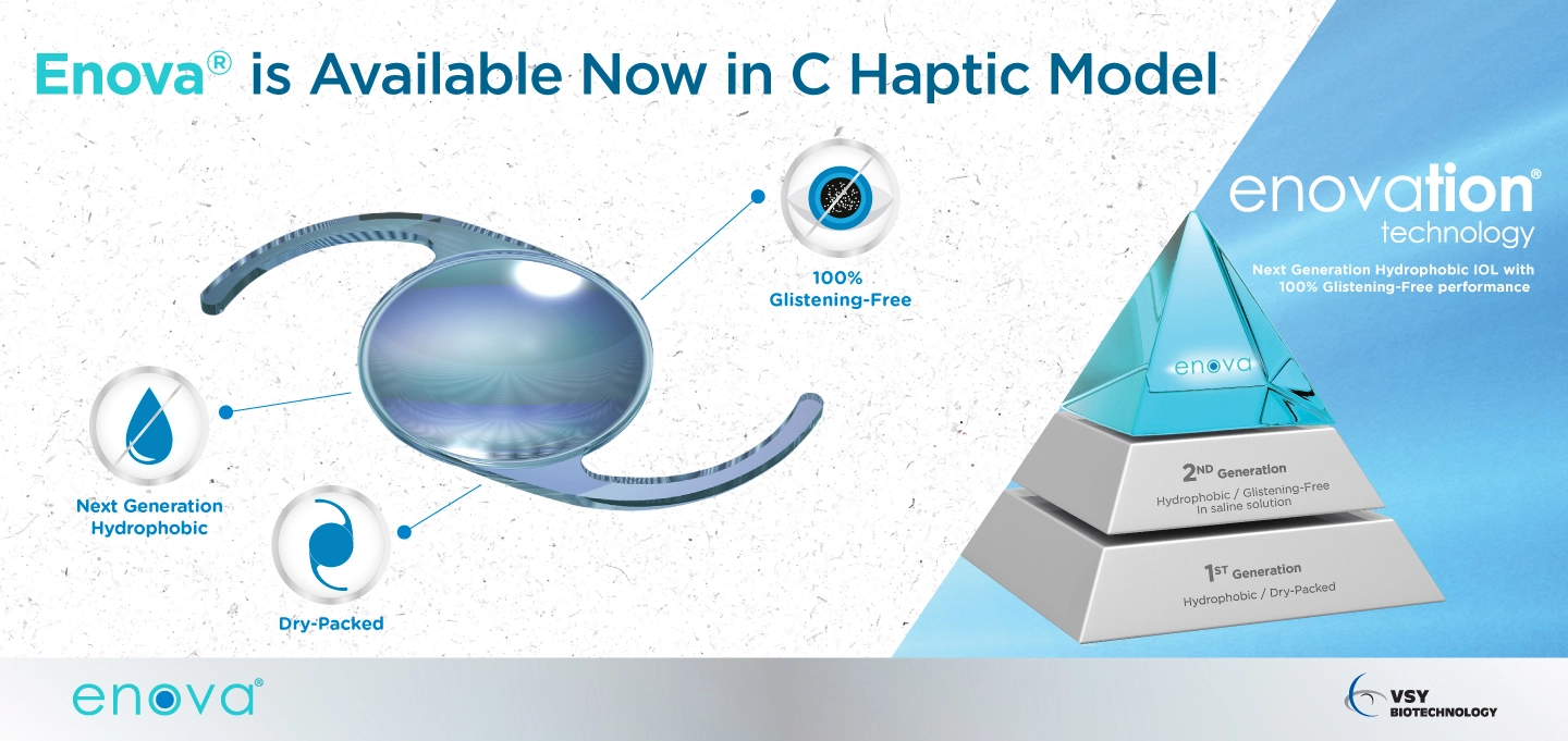 VSY Biotechnology announces the launch of the Enova® C Haptic Model IOL. Enova® is the first and only 100% Glistening-Free, Dry-Packed hydrophobic acrylic IOL. Moreover, no warming or special conditioning is required before surgery!